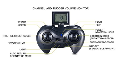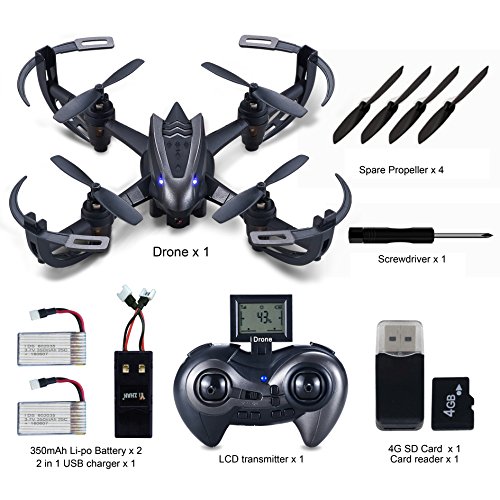 Produktbeschreibungen: Frequenz: 2.4G Kanal: 4CH Gyro: 6 axis Material: ABS Quadcopter-Größe: 145 x 135 x 25 mm Quadcopter-Gewicht: 39g Flugzeit: 5 – 7 Minuten Flugweite: ca. 30-50 m Ladezeit: ca. 60 Minuten Akku für quadcopter: 3.7V 350mAh (im Lieferumfang enthalten) Batterie für den Sender: 2 x 1.5V AA Batterie (Batterie nicht im Lieferumfang enthalten) Kamera: 2.0MP Packliste: 1x Hasakee Drohne mit 720P Kamara und 4x Rotorschützer 1 x LCD Transmitter 1x 3.7V 350mAh Batterie 1x Bonus 3.7V 350mAh Batterie 1x 2 in 1 Batterie Ladegerät 4x Ersatz-Propellern 1x 4G Speicherkarte und Kartenleser 1x Schraubendreher 1x Handbuch