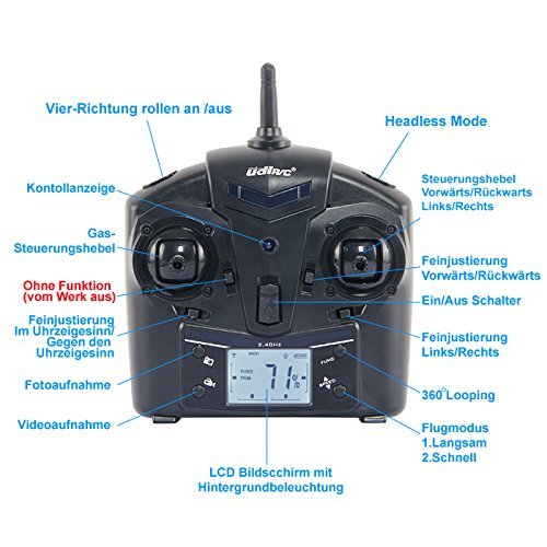 s-idee® U818A 4.5 KANAL QUADCOPTER MIT PRO HD KAMERA UDI GALILEO X-Mas TESTSIEGER-DROHNE auf Pro7 4.5 KANAL QUADCOPTER MIT DER NEUESTEN GYROSCOPE-TECHNOLOGIE! NEU! Dank dem eingebautem Akku-Warner zeigt die Drohne an, dass die Akkus fast leer sind Der Quadcopter besitzt eine 4,5 KANAL STEUERUNG, Mod1 bzw. Mod2 einstellbar Quadcopter s-idee® U818A inkl. HD Kamera ist fertig montiert und die Elektronik ist bereits eingebaut und angeschlossen. Nur noch den Akku laden, Batterien in den Sender und losfliegen. SIE WERDEN BEGEISTERT SEIN! Hauptmerkmale: – 4,5-Kanal 2,4 GHz Steuerung LCD Display – zwei Modi wählbar – Wählen Sie zwischen Einsteiger- und Expertenmodus, um das Gerät an Ihrer persönlichen Bedürfnisse anzupassen – 360°-Rolle – Im Expertenmodus sind spektakuläre 360° Drehungen möglich – Powermotoren für INDOOR- UND OUTDOOR-FLÜGE – 3,7V 500 mAh Li-Po Powerakku – Akkuwarner – HD FOTO- / VIDEOFUNKTION mit Tonaufzeichnung – Trimmung an der Fernsteuerung für sehr genaue Einstellungen! – Ladezeiten ca. 120 min. – Flugstabilisierung, 6-Achs Kreiselsystem – Abmessungen: 33,5 x 33,5 x 6,8 cm – geeignet ab 14 Jahren Lieferumfang: – Quadcopter s-idee® U818A mit HD Kamera – 4,5-Kanal 2,4 GHz Steuerung mit LCD Display – 1 x Powerakku LiPo 3,7V 500 mAh – Ersatzakkus s-idee 01174 gleich mitbestellen – Ladeadapter zum Aufladen des Powerakkus – 2 GB Micro SD Karte + Kartenleser – 4 Ersatz Propeller – Schraubendreher – deutsche s-idee® Bedienungsanleitung