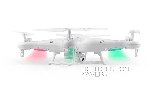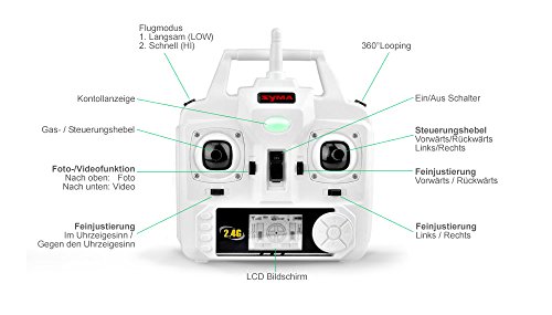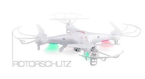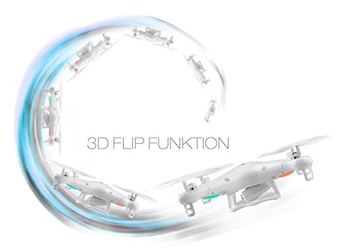 Durch seine Funktionen und das Zubehör unterscheidet sich diese Drohne erheblich von den anderen Produkten in dieser Preisklasse. NEU! Automatische Motor-STOPP-Funktion welche die Motoren abschaltet sollte sich ein Rotor nicht drehen können. NEU! Dank dem eingebautem Akku-Warner zeigt die Drohne an, dass die Akkus fast leer sind. Durch seine gewichtsoptimierte Bauweise ist dieses Produkt perfekt als wendige Indoor- und Outdoor Drohne geeignet. Präzise Flugmanöver sind durch die perfektionierte Mechanik in Verbindung mit der leistungsfähigen Motorentechnik kein Problem und leicht durchzuführen. Der ideale Einstieg in den 4 D Flug! Die Drohne kann mit zwei Geschwindigkeiten geflogen werden, um die 360°- Loopings fliegen zu können. Auf der Fernbedienung wird Ihnen der jeweils eingestellte Modus angezeigt. Mode 1: langsam, geeignet für Anfänger und zum Einstellen des FlugverhaltensMode 2: schnell, geeignet für fortgeschrittene Piloten Nur noch Akku laden, Batterien (4 x 1,5V AA, nicht im Lieferumfang enthalten) in die Fernbedienung reinlegen und losfliegen. TECHNISCHE DATEN: 2,4 GHz- 4 Kanal Maße: Kantenlänge 31,5cm, Höhe 7,5cm Auflösung: Video 720P(1280*720), Foto 2560*1440 Megapixel: 1,2 MP Format 4:3 Ladezeit: ca. 60 Minuten (Laden über USB) Flugzeit 8-10 Minuten pro Akku Reichweite: über 80 Meter LIEFERUMFANG: – Syma X5C Explorer Weiße Deutsche AGETECH® GmbH Sonder-Edition – 2.4GHz weiße Fernsteuerung – 2 Akkus 1 x 3,7 V/ 500 mAh & 1 x 600 mAh Li-Poly – Micro SD Speicherkarte 4 GB (schon eingesetzt) – AGETECH® GmbH SafeFly Sonnenbrille CE zertifiziert – USB-Ladegerät – USB SD Kartenlesegerät – Ersatzrotoren 4 Stück (Inkl. Schraubendreher) – Bedienungsanleitung Deutsch, Englisch